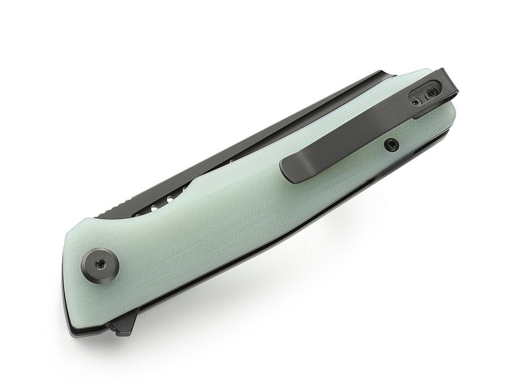 Rukojeť nože je vyrobena z nefritového G10, materiálu známého svou pevností a odolností. Textura rukojeti poskytuje pevný a bezpečný úchop, což je důležité pro přesnou a bezpečnou práci s nožem. Nefritová barva přidává noži elegantní vzhled, který se hodí do každé situace.