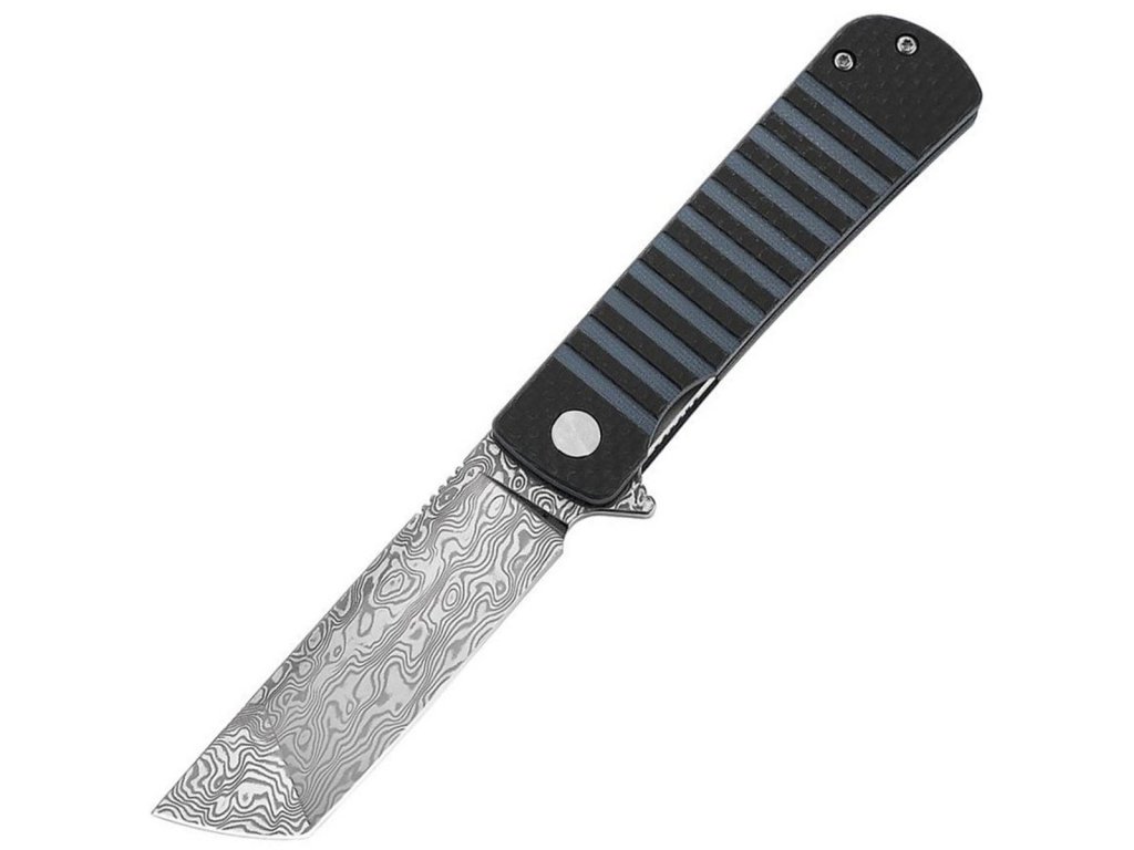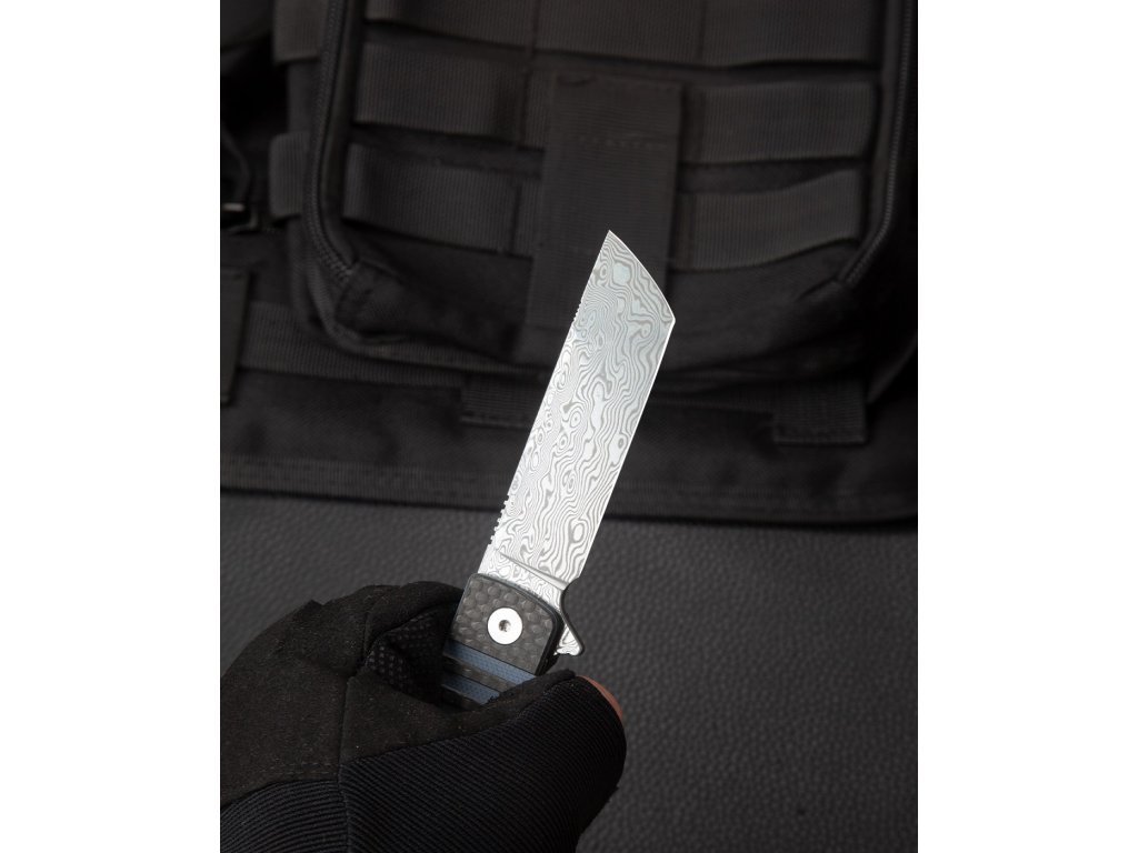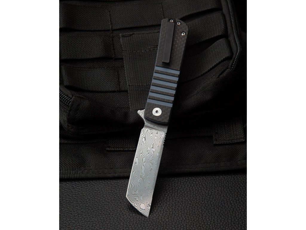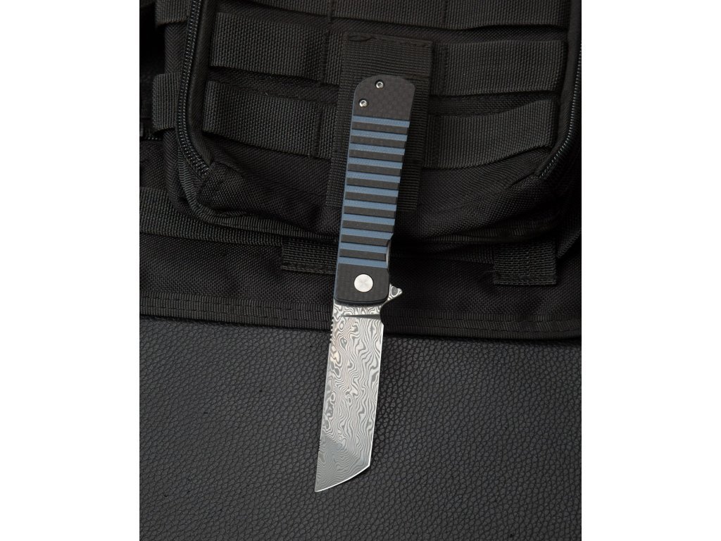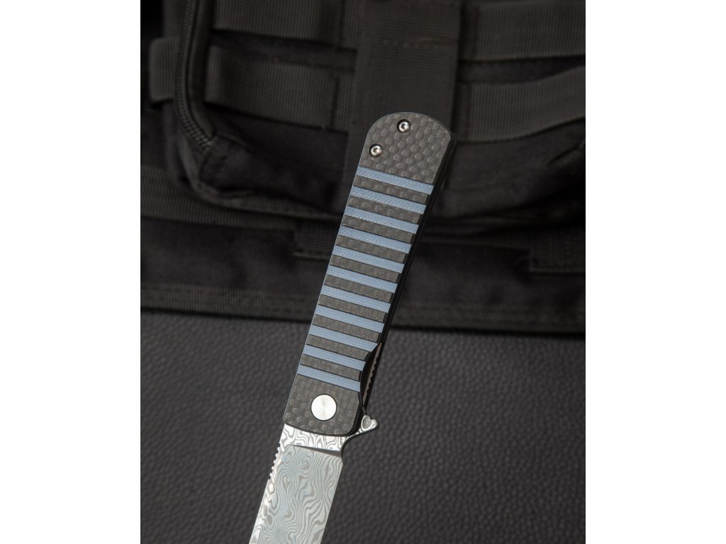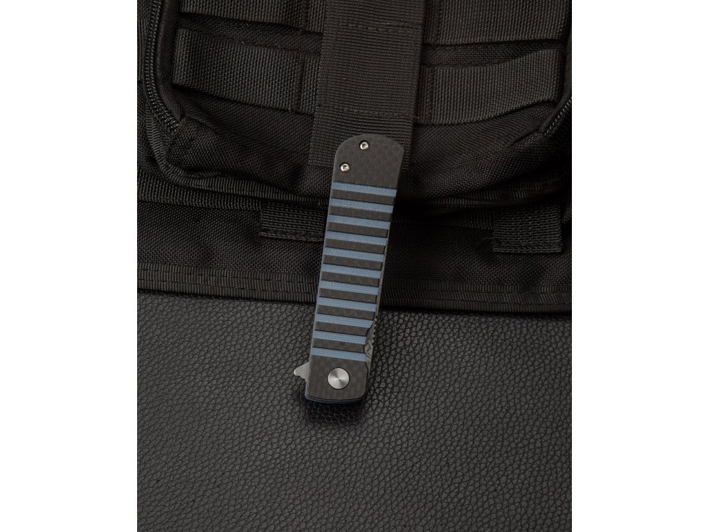 Rukojeť nože kombinuje černé uhlíkové vlákno s tmavě modrou G10. Tato kombinace materiálů zajišťuje lehkost a vysokou odolnost. Moderní design rukojeti poskytuje pevný a pohodlný úchop, což je důležité pro bezpečné a efektivní používání nože.