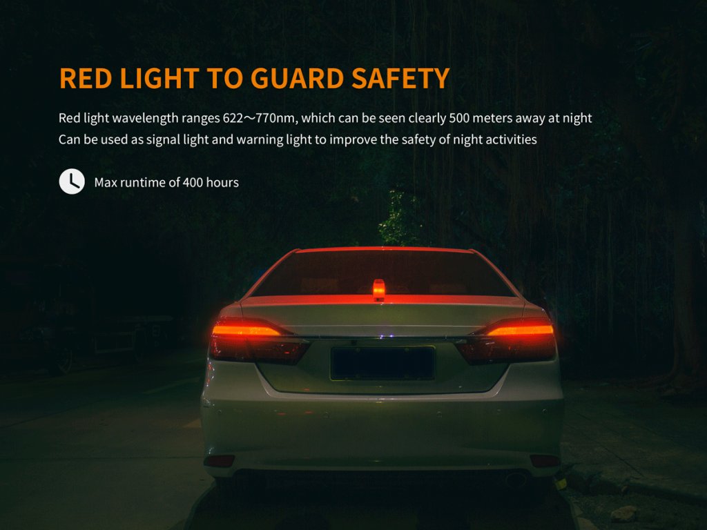 Pro zapnutí a vypnutí vojtěšky podržte boční tlačítko stisknuté po dobu 1 sekundy. Režimy bílého světla se cyklicky přepínají krátkým stisknutím tlačítka, zatímco červené světlo se aktivuje dvojitým rychlým stisknutím. Dalším stisknutím se přepne do režimu červeného blikání. Funkce prodloužení výdrže automaticky snižuje výkon při delším používání v režimech 400 a 150 lumenů.