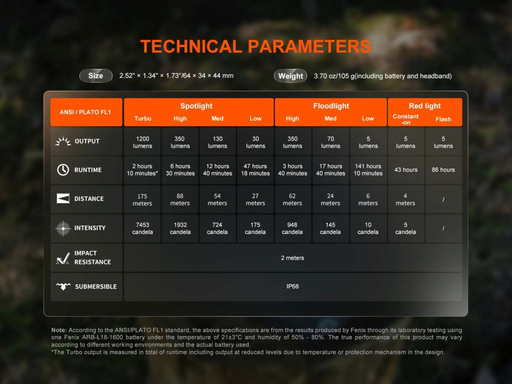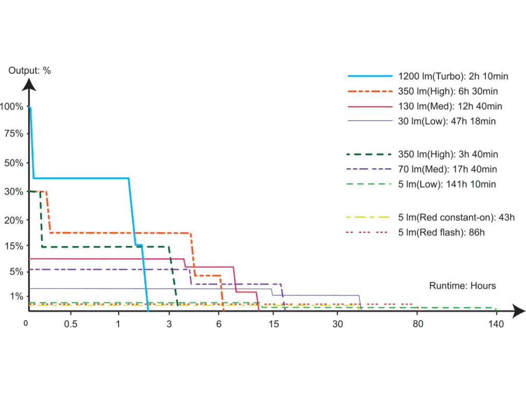 - Výdrž: až 141,2 hodiny při širokém reflektoru / až 86 hodin při červeném blikání
