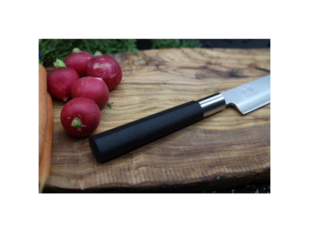 - Precizní jednostranná čepel – speciální broušení na jedné straně zajišťuje mimořádně ostrý řez, ideální pro sushi a sashimi.