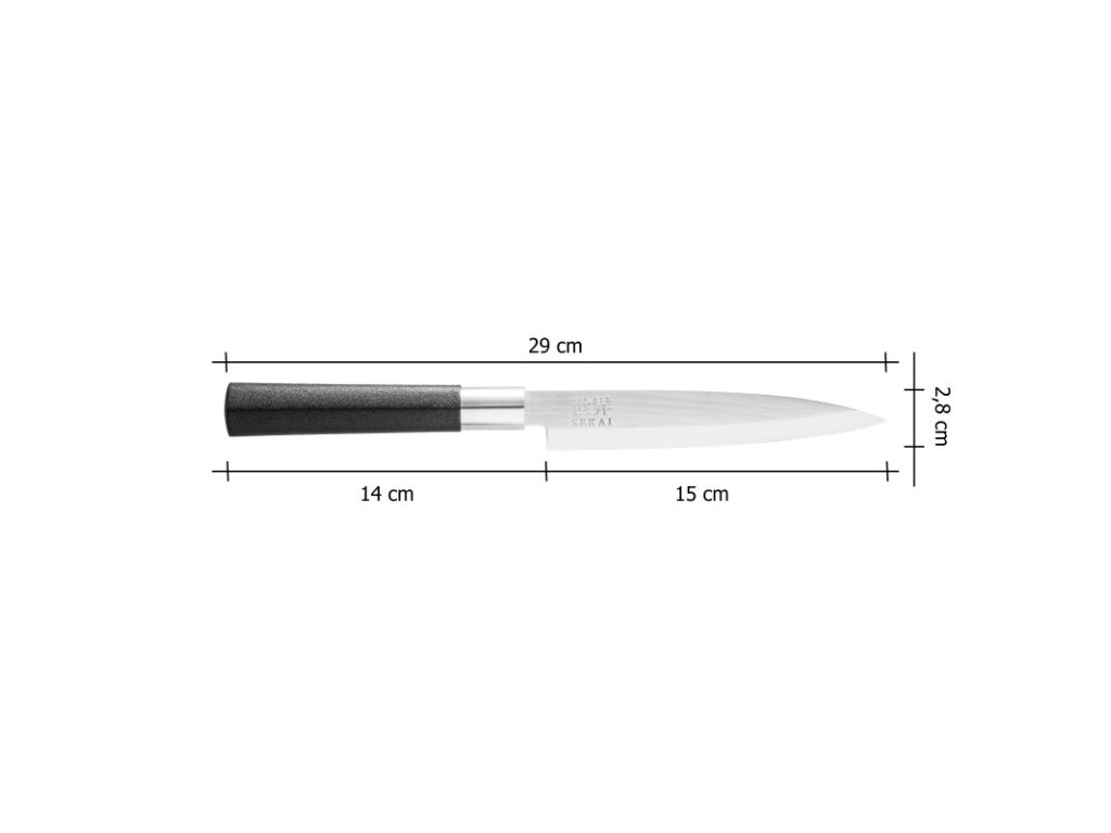 - Délka čepele: 15 cm – ideální velikost pro precizní krájení syrových ryb a masa.