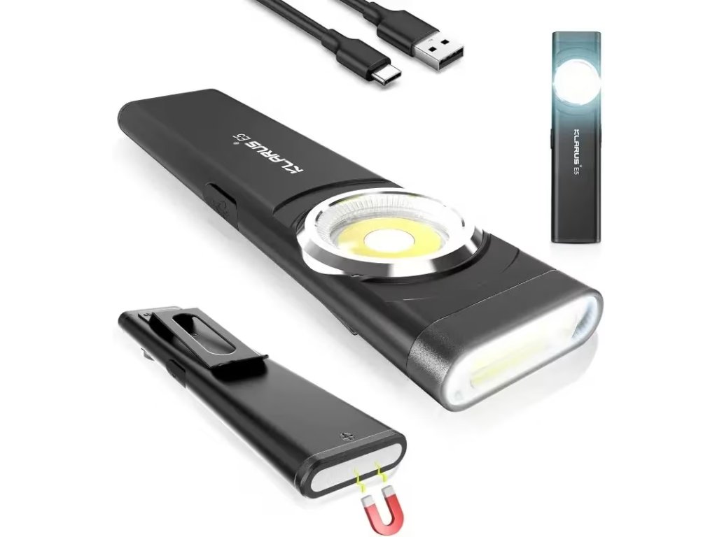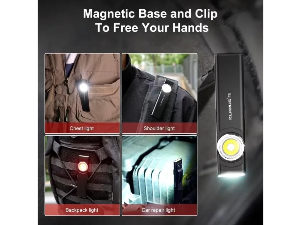 Velkou předností modelu Klarus E5 je magnetická základna, která umožňuje pevné uchycení na kovové povrchy a pohodlnou práci s volnýma rukama. Praktický klip usnadňuje nošení v kapse, na opasku nebo v pracovní výbavě, takže máte svítilnu vždy okamžitě po ruce.