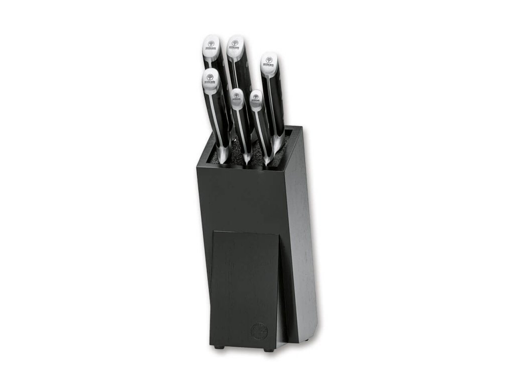 - Stojan na nože Böker Gusto Wood Black: vyrobený z masivního tmavého dřeva s vyjímatelnými plastovými štětinkami, které chrání ostří nožů. Stabilní (2,1 kg), s protiskluzovými nožičkami a dostatkem prostoru i pro ocílku.