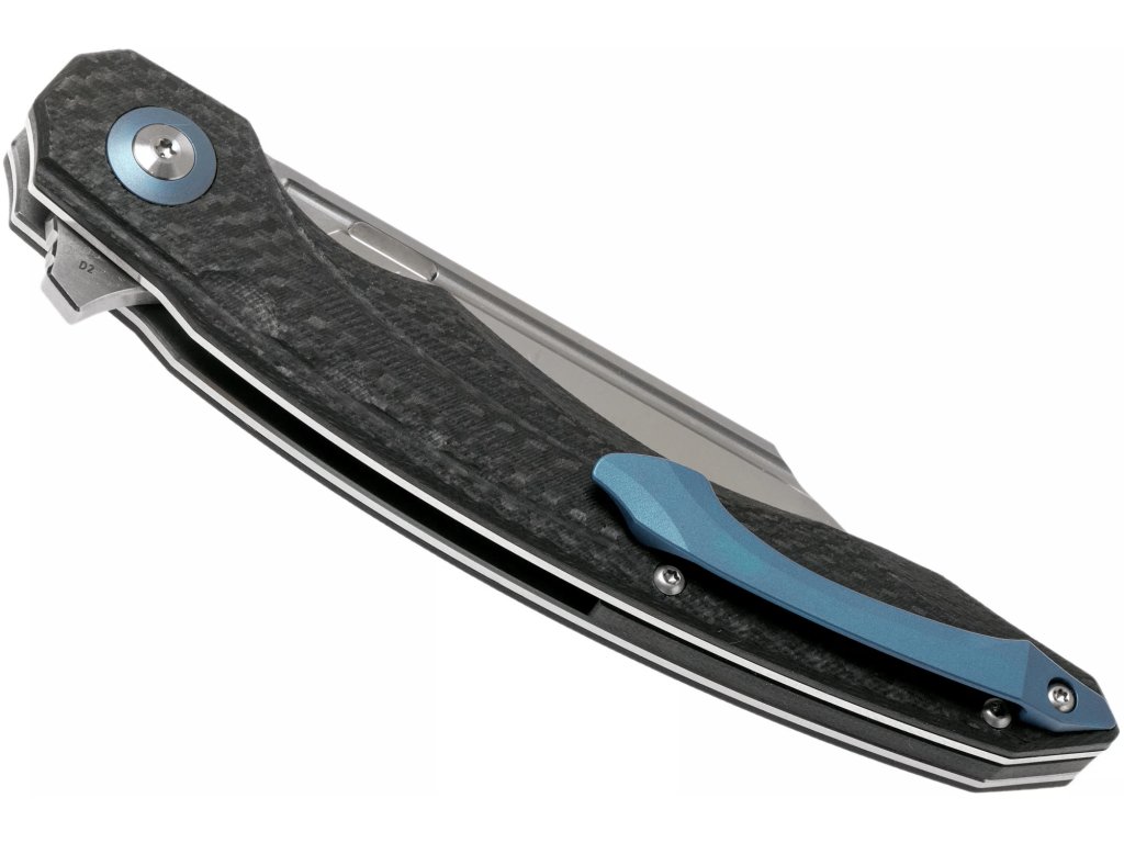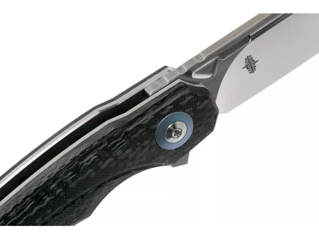 - Rukojeť z G10 a karbonového vlákna – lehká, pevná a vizuálně atraktivní s efektem připomínajícím damascénskou ocel.