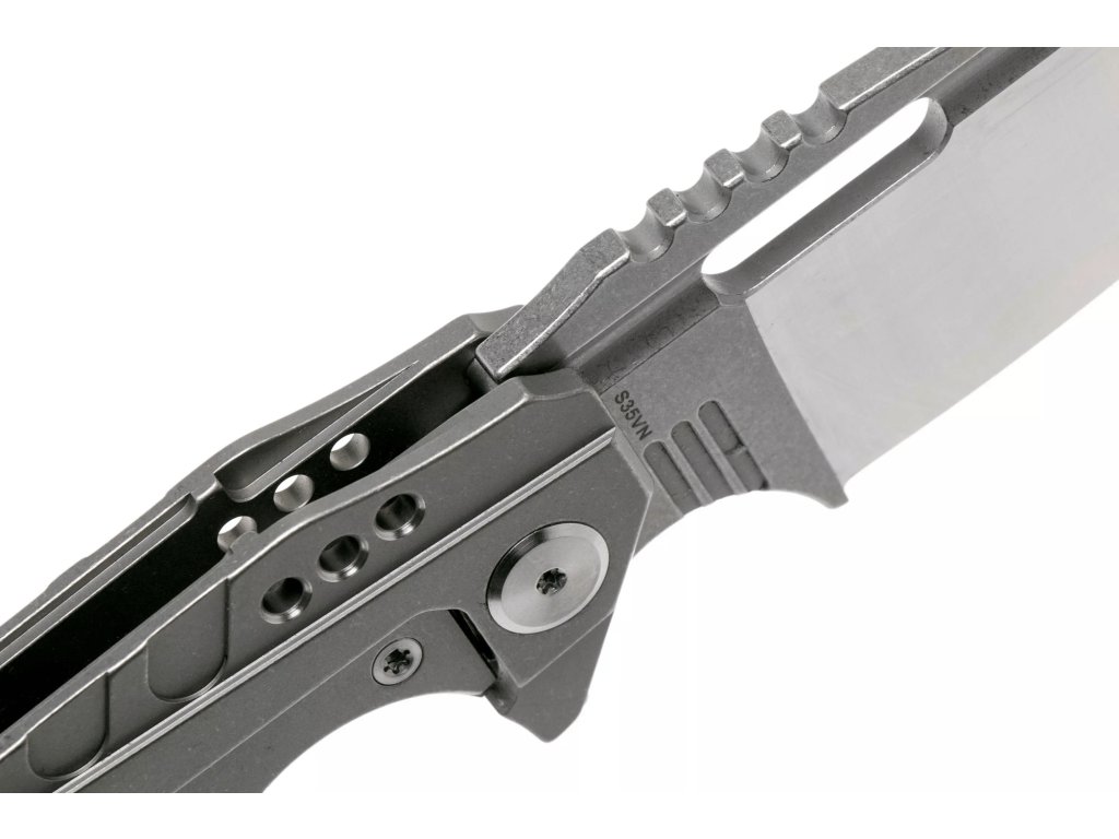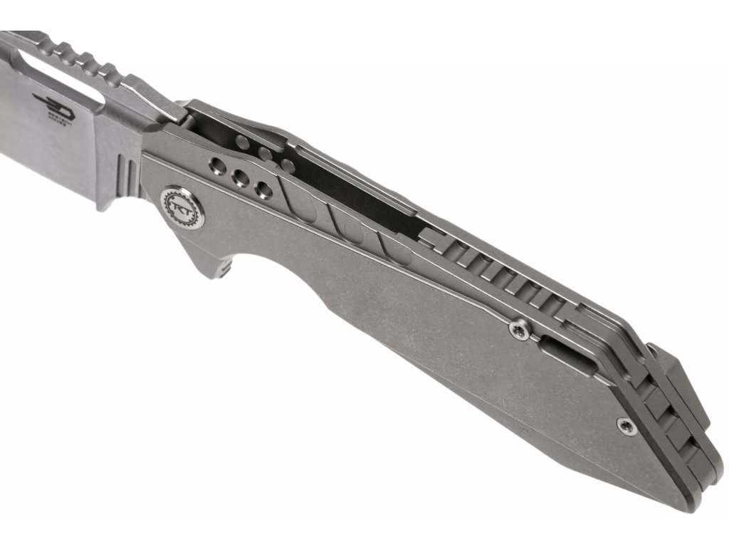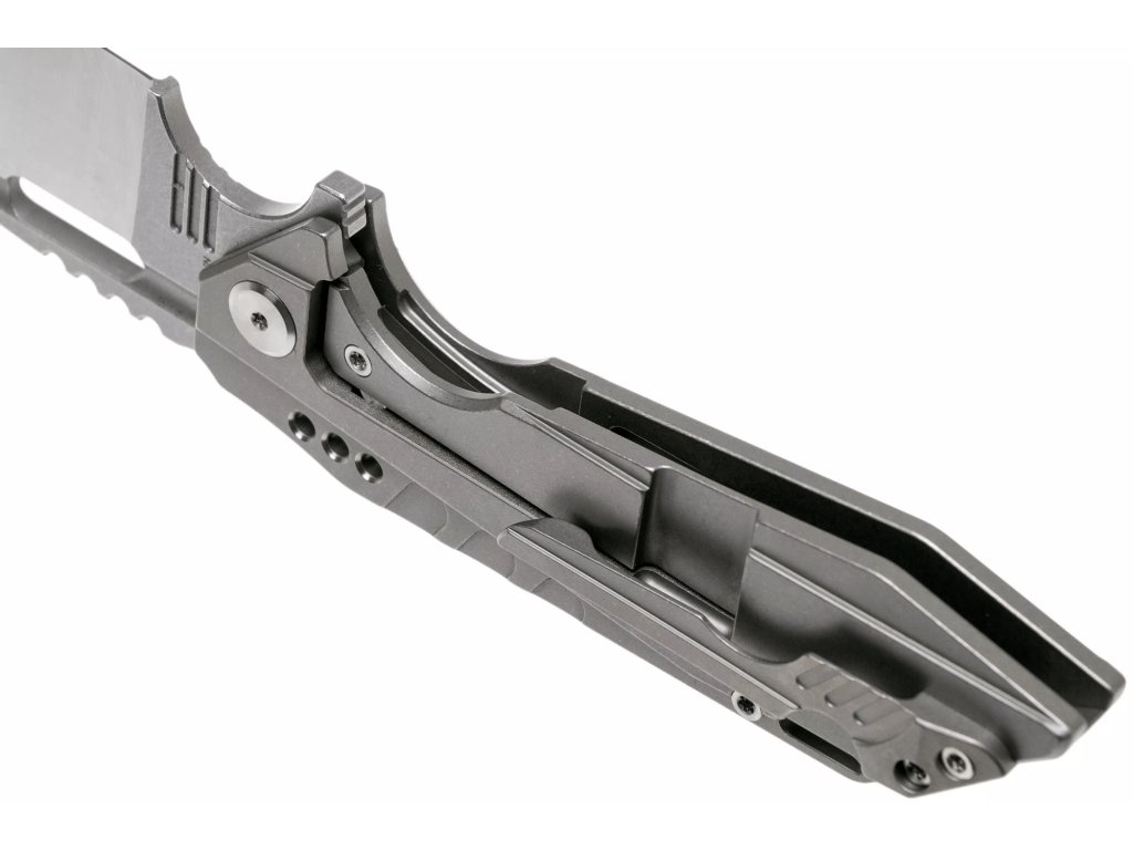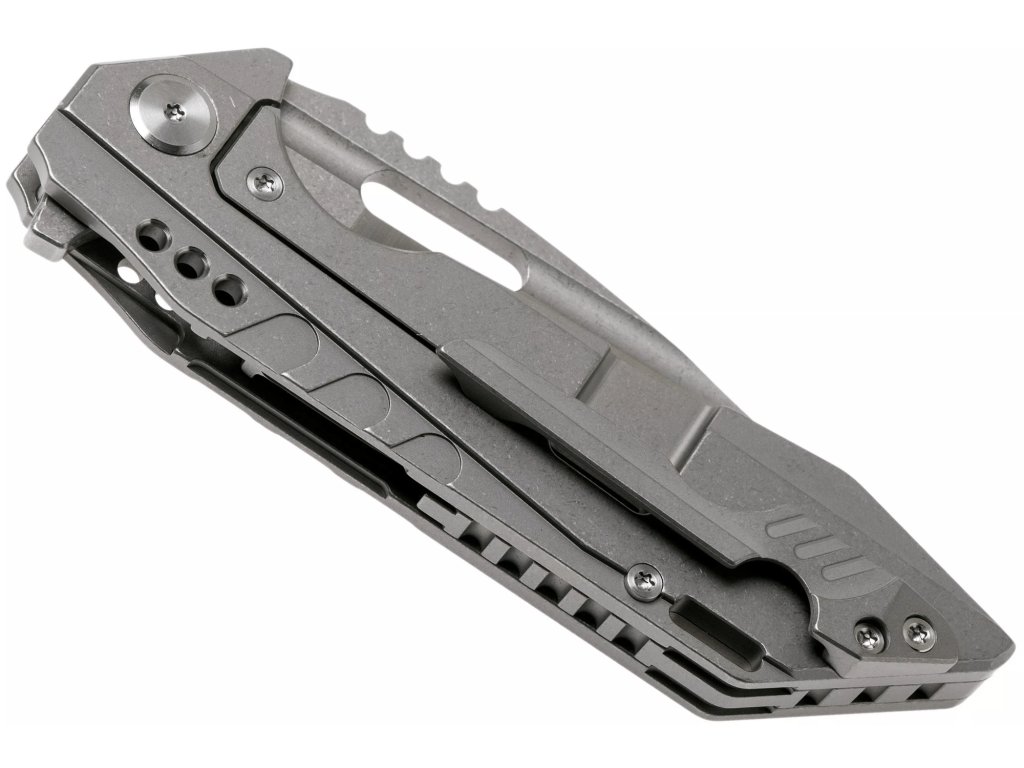 - Titanová rukojeť 6Al4V – lehká, extrémně pevná a ergonomicky tvarovaná s precizně frézovanými detaily.