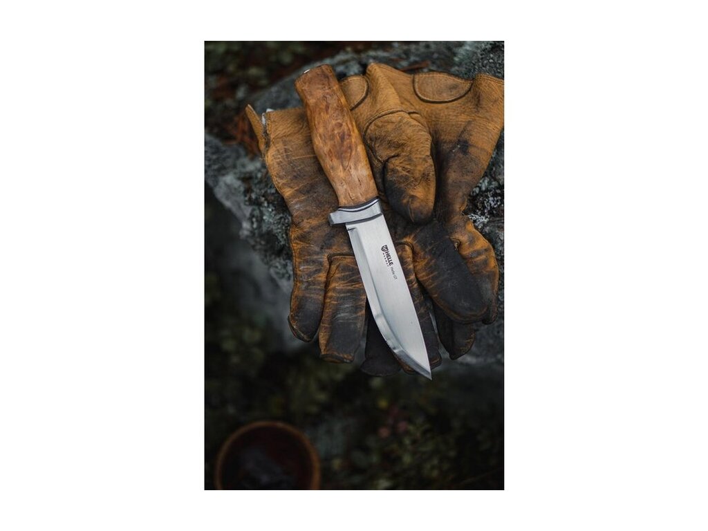 Čepel je vyrobena z prvotřídní švédské nerezové oceli Sandvik 14C28N, která vyniká dlouhou výdrží ostří, vysokou tvrdostí a výbornou odolností vůči korozi. Tradiční skandinávský výbrus (Scandi) zajišťuje skvělé řezné vlastnosti při práci se dřevem, zatímco rukojeť z kudrnaté břízy nabízí ergonomický a přirozený úchop. Nůž má konstrukci stick tang a dodává se s kvalitním koženým pouzdrem.