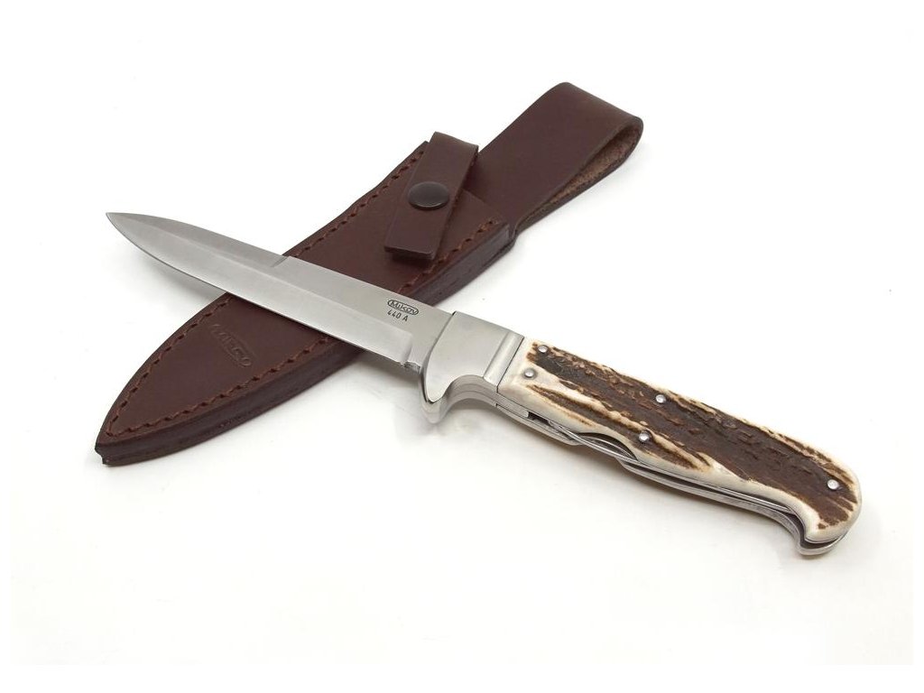 Nůž Mikov Dýka Jelenárska 370-XP-3 je precizně zpracovaná lovecká dýka z dílny Mikov Mikulášovice, určená pro náročné lovce a milovníky tradičního řemesla. Čepel ve tvaru zavazáku je vyrobena z nerezové oceli 440A s tvrdostí 54–57 HRC, což zaručuje vysokou odolnost, pevnost a snadné broušení. Rukojeť z pravého jeleního parohu v sobě skrývá praktickou pilku a párací hák, díky čemuž se z nože stává univerzální nástroj pro použití v přírodě.