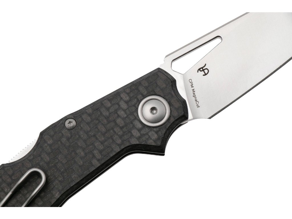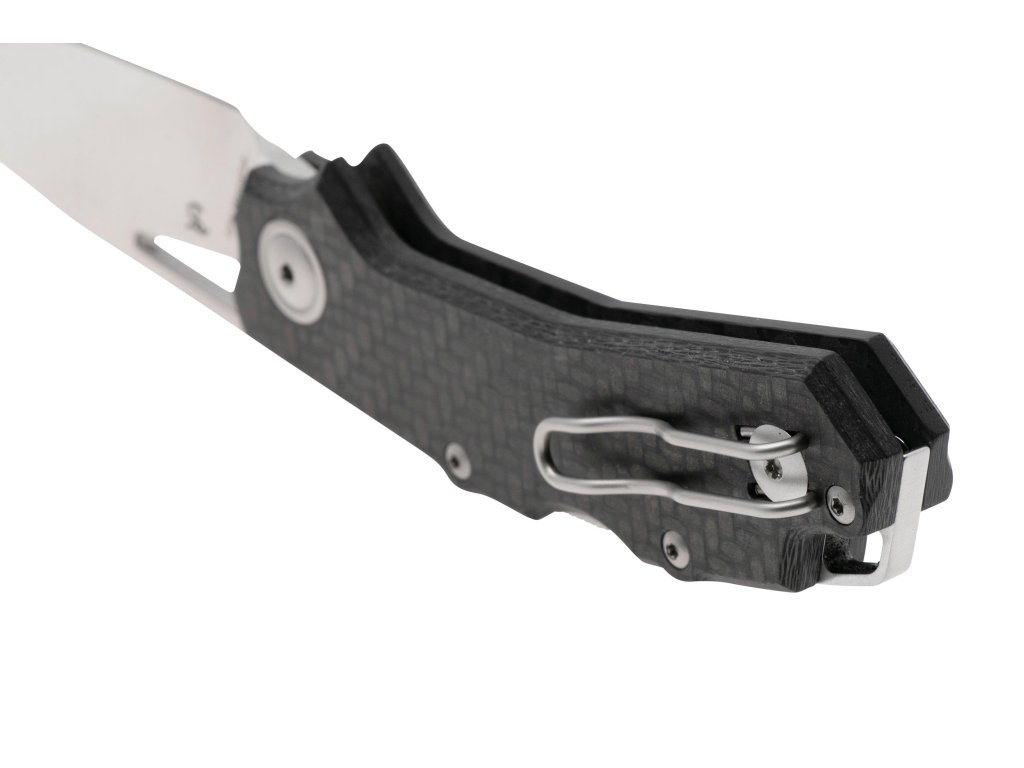 Rukojeť z uhlíkových vláken (carbon fiber) poskytuje maximální pevnost při minimální hmotnosti. Nůž využívá osvědčenou back-lock pojistku a je vybaven otvorem pro palec, díky čemuž jej lze otevřít jednou rukou. Klip lze připevnit z obou stran – vhodné pro praváky i leváky.
